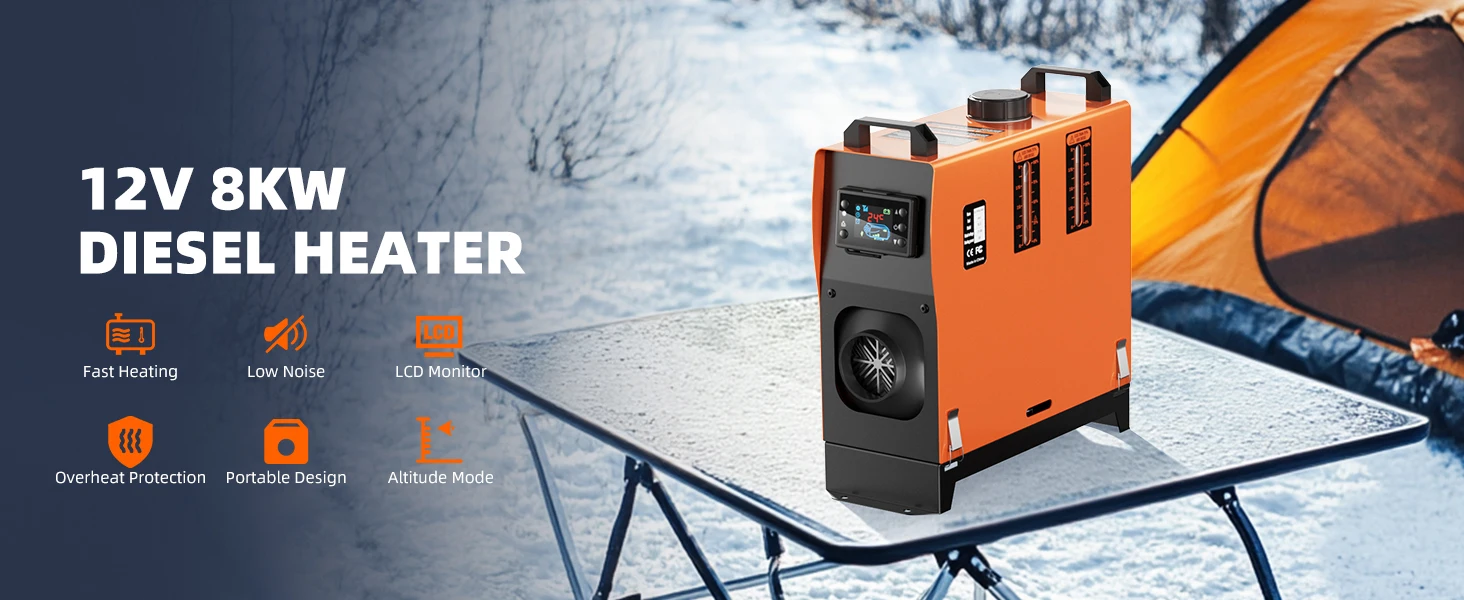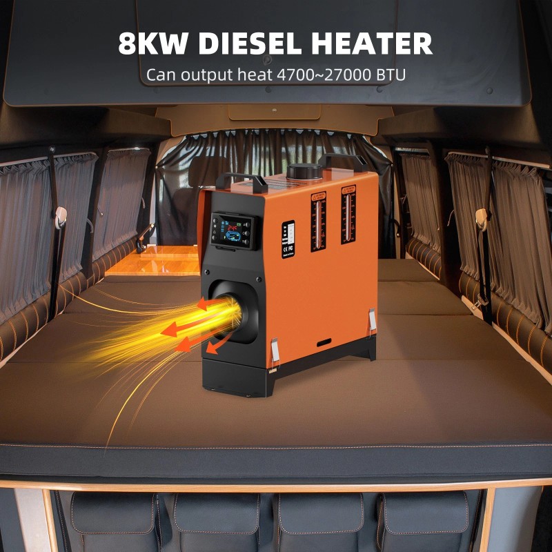 Introducing the 8KW Diesel Heater – a versatile 12V portable parking heater designed for rapid and efficient heating in diverse environments. This all-in-one diesel air heater features a sleek orange design, equipped with a smart LCD screen and remote control for intuitive operation. Ideal for trucks, RVs, trailers, campers, and boats, it delivers powerful 8KW heating performance while maintaining low noise and high fuel efficiency. With a 5L fuel tank and adjustable temperature range (46.4°F-96.8°F), it quickly heats spaces up to 270 ft², making it perfect for indoor/outdoor use in bedrooms, kitchens, patios, and more.