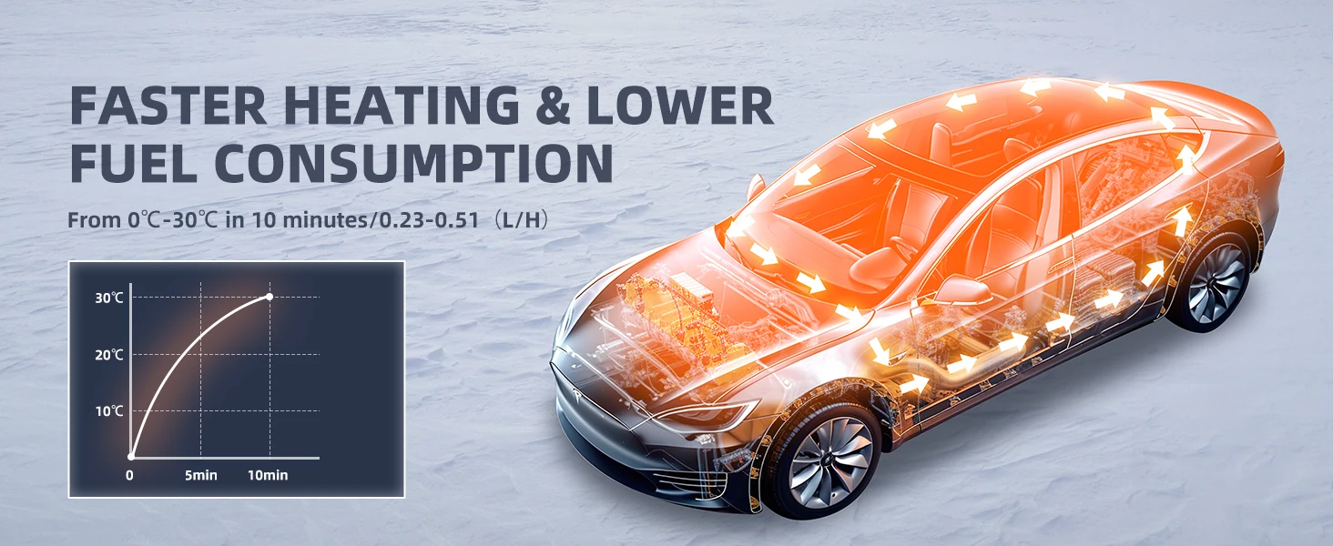 Equipped with an 8KW sandblasted aluminum heat exchanger, this diesel heater delivers 4,700-27,000 BTU of heat, warming areas up to 270 ft² within 10 minutes. Its fast heating capability ensures immediate comfort in cold environments.Energy-Efficient & Cost-Effective