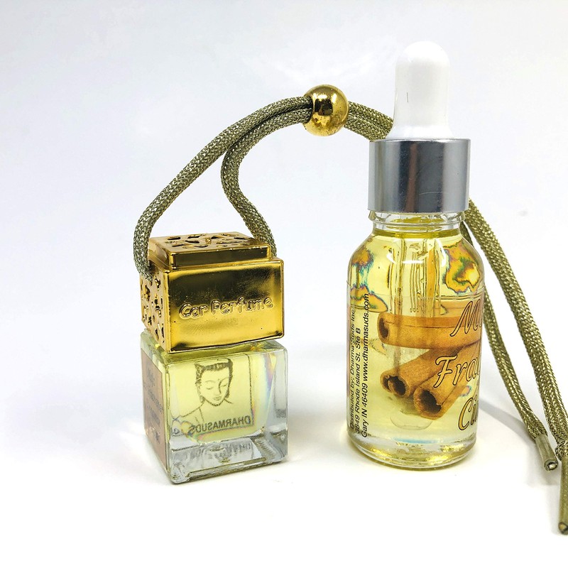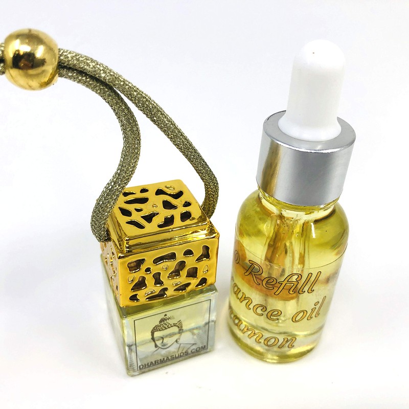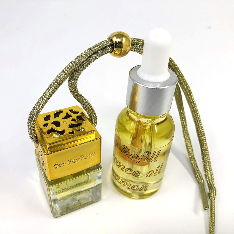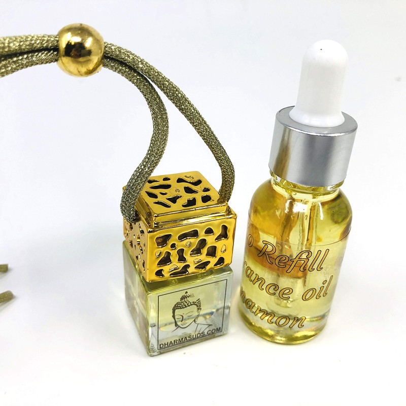 Spicy cinnamon-scented car perfume mojo freshener glass container measure 1x2 inches hold .27 oz of fragrance the set includes 2 extra refills .5 oz glass bottle with dropper the wood cap allows the scent to be distributed and the cap is elegant gold plated, not you gas station tree freshener this is classy and elegant. ** Please remove the cap sealer of the bottle before use.