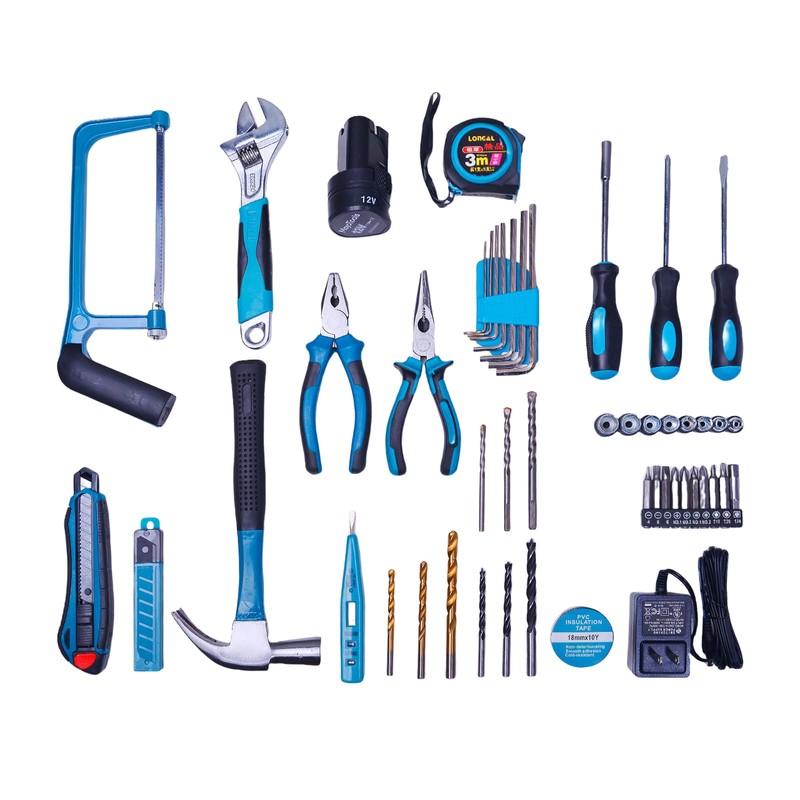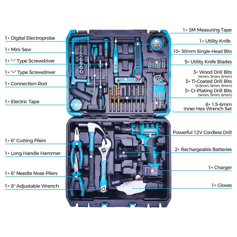 - 117-Piece All-in-One Tool Kit – Comes with drill bits, screwdriver bits, wrenches, tape measure, and more, packed in a portable storage case for easy organization.