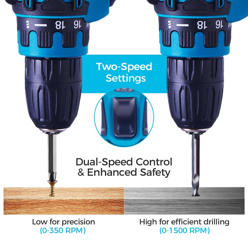 - Dual-Speed & 18+1 Torque Settings – Features 0-350RPM & 0-1350RPM speeds and precision torque control, perfect for drilling into wood, metal, plastic, and fastening screws.