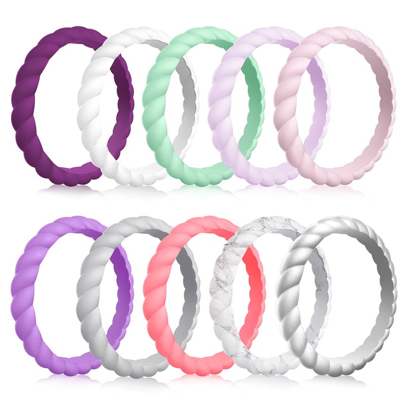 MOKANI - Anillo de boda de silicona para mujer, paquete de 10 bandas de goma finas y trenzadas, a la moda, colorido, ajuste cómodo, seguro para la piel