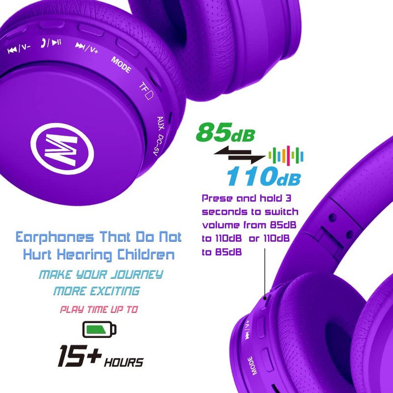 - Safety volume limit: (Two Mode: 85dB -Kids(Default) , 110dB -Aldult )This headphones protect your kids from hearing hurting (the level-85dB : the World Health Organization considers safer). The volume can be switched from 85dB to 110dB when you press and hold pause/play button 3 seconds