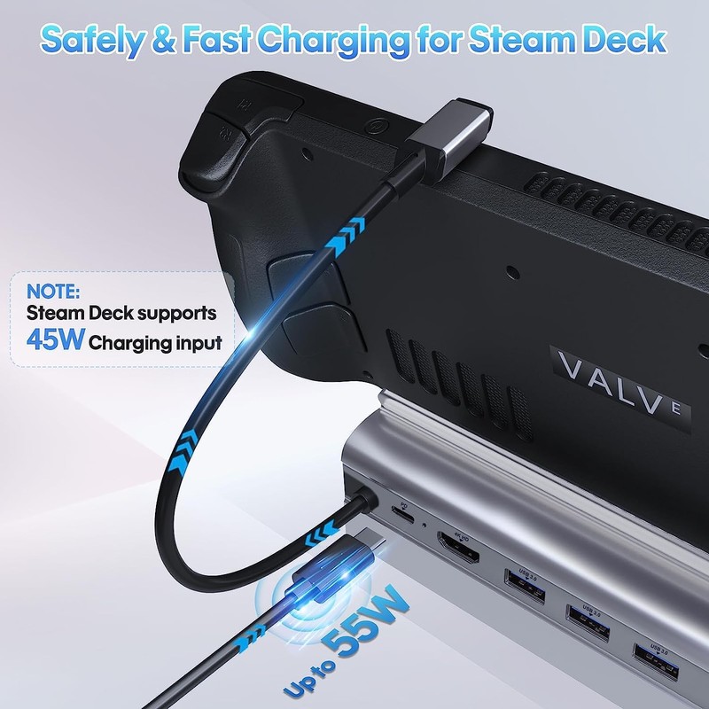 - 【Full Charging Speed for Steam Deck】B3 Steam Deck docking station supports 60W Max power delivery, which is sufficient to charge your Steam Deck at full speed when paired with the original charger. [Note: the MAX charging speed of Steam Deck is 45W]