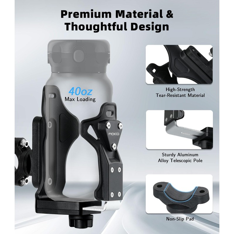 - Sturdy and Stable: The body of the bottle holder bike is made of high-strength composite materials, with aluminum alloy telescopic rods, which is sturdy and durable, and can bear a maximum load of 40 ounces. The anti-fall wrapping structure can firmly fix the bottle, and you don't have to worry about the bottle falling. The handlebar clamp has a built-in anti-slip pad to ensure stability even on bumpy roads.