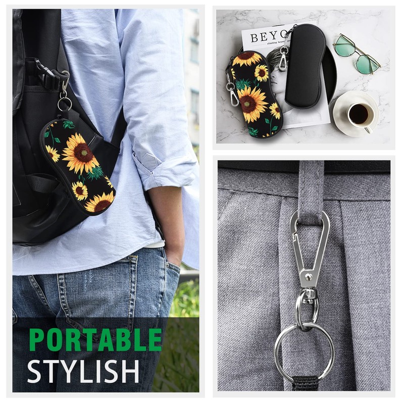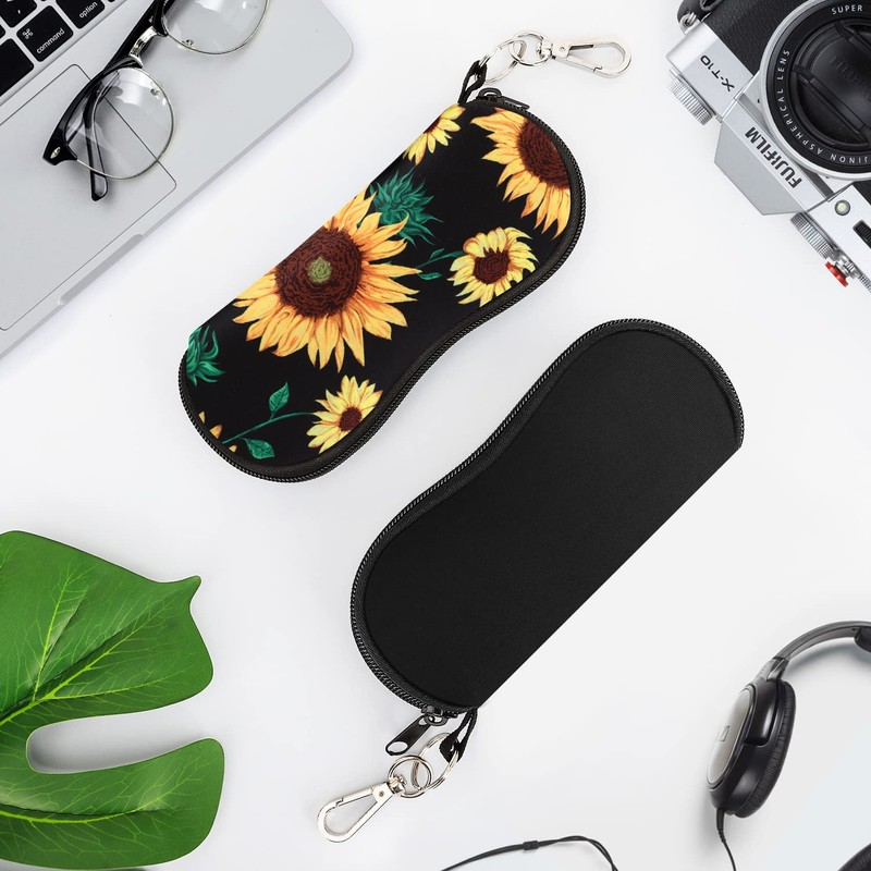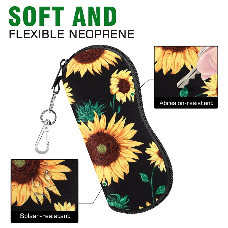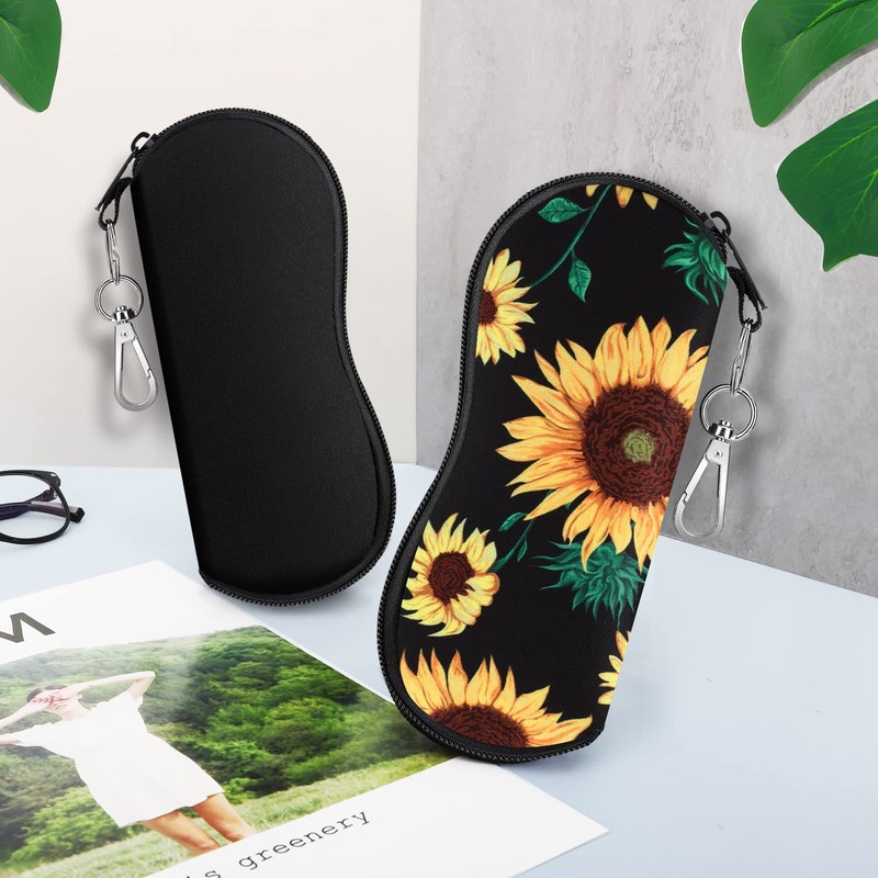 MoKo Sunglasses Soft Case 2 Pack, Ultra Light Portable Neoprene Zipper Glasses Soft Case, Eyeglass Safety Pouch Zipper Box Case with Belt Clip, Black + Sunflower