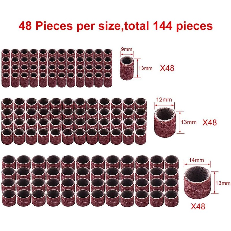 - Sanding drum set: sanding sleeves set comes with 144 pieces drill sanding bands and 6 pieces sanding drum mandrels. Total 150 pieces with a free plastic box, convenient for storing and retrieving
