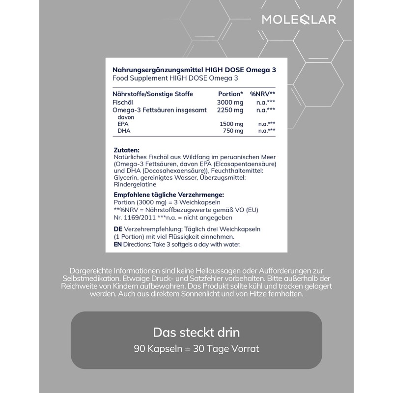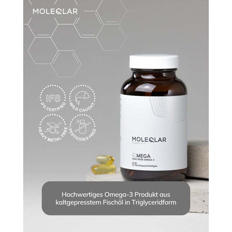 - PREMIUM OMEGA 3 HOCHDOSIERT - MoleQlar High-Dose Omega 3 ist formuliert mit hochreinem, kaltgepressten Qualit?ts-Fisch?l in Triglyceridform aus norwegischem Wildfang. QMEGA ist deutlich h?her dosiert als Vergleichsprodukte mit 2250mg DHA/EPA pro Portion.