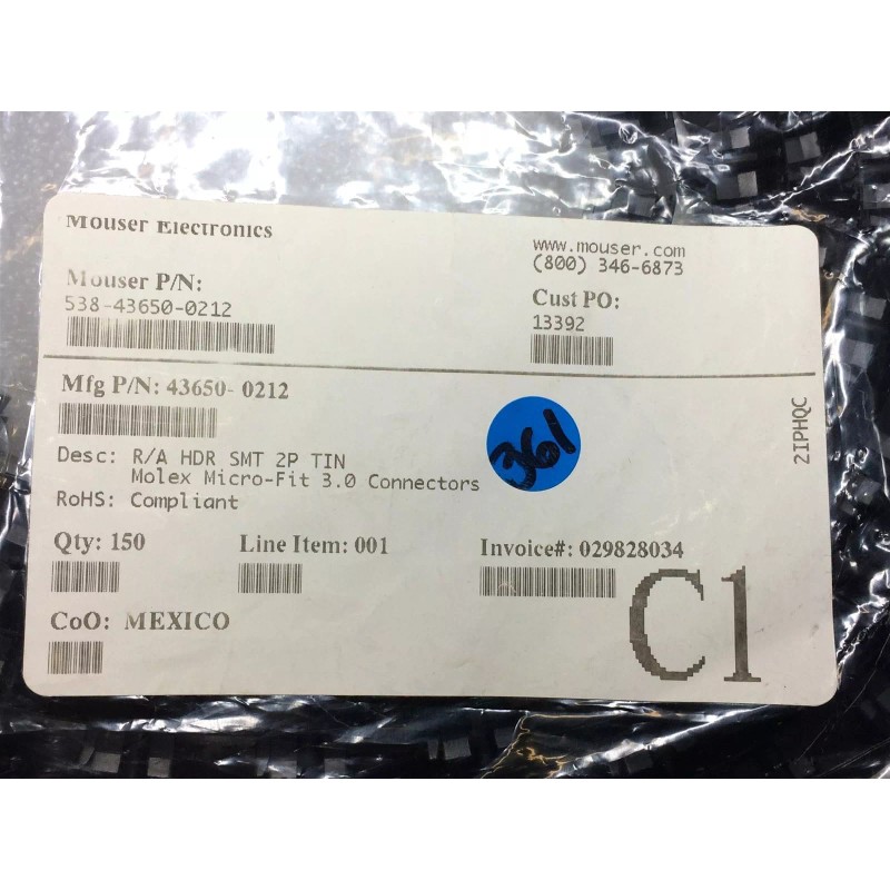 We are selling 20 piece lots of P/N 43650-0212 at a fixed price of $13.50. Parts are RoHS compliant. If you are interested in a larger quantity message us with the details or make us an offer on the full quantity we are listing.