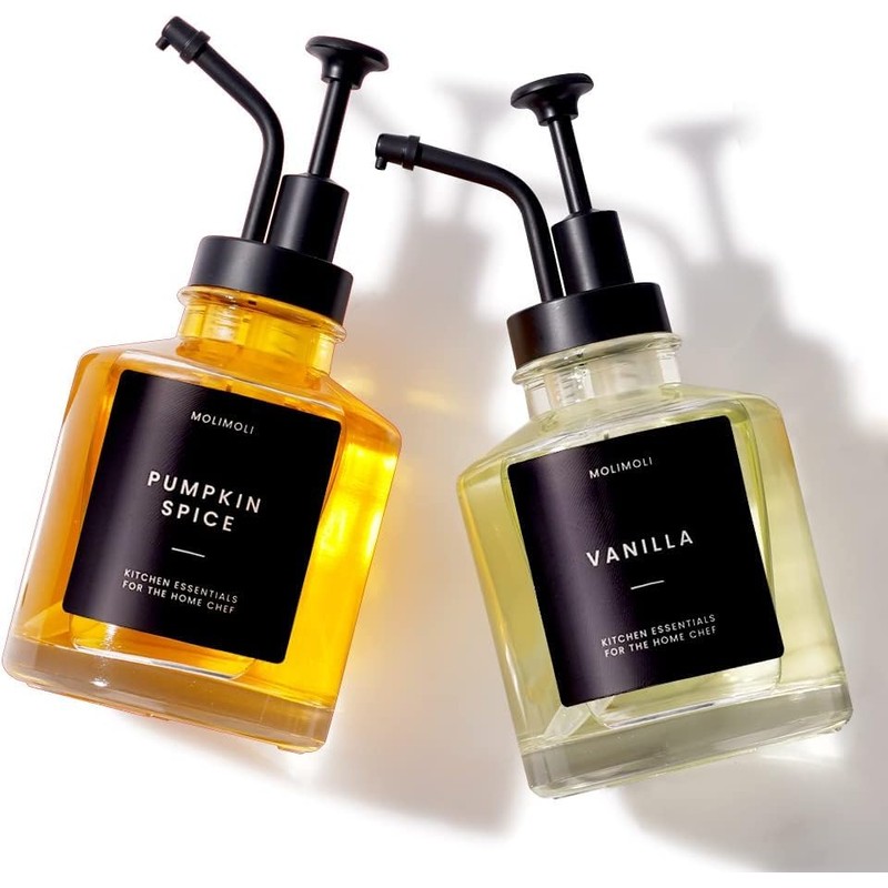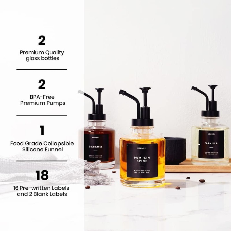 - Molimoli Syrup Dispenser Set: Each Set includes two custom-made high quality coffee syrup bottles, two PVC black pumps, a funnel and a prefixed label set.