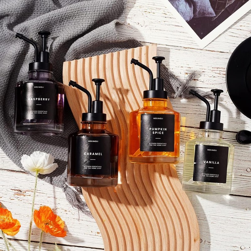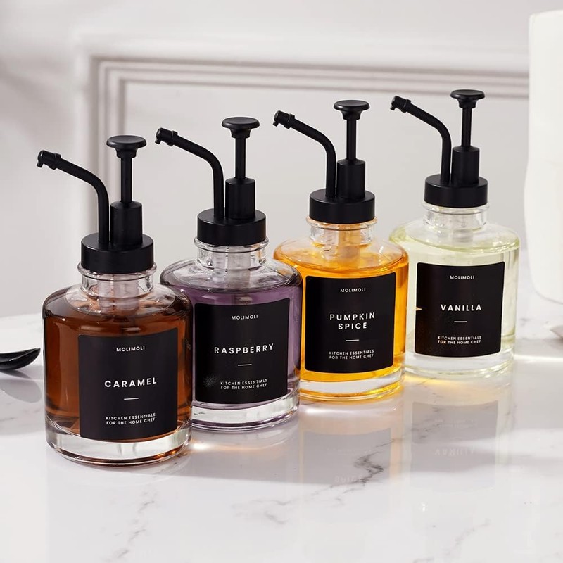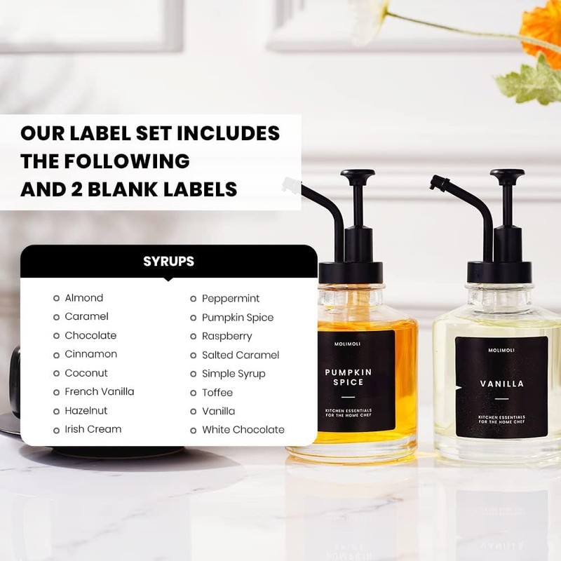 - Coffee Syrup Label Included: Every syrup dispenser set includes a package of custom-designed coffee syrup labels and two blank labels to keep your kitchen organized .
