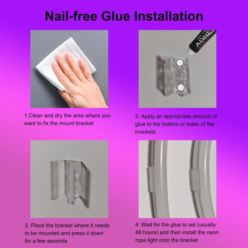 - The bracket can be fixed with the included screws or nail-free glue. Just pre-set the position of the brackets before installation, then fix the brackets and then fit the neon rope light into the brackets. Note: Please refer to the notes in the picture when using nail-free glue to mount the brackets