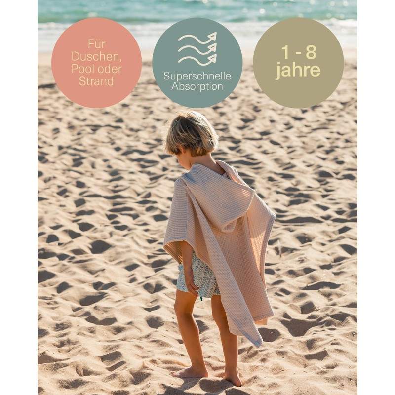 - Quick absorption: our children's bath poncho with waffle structure is characterised by its ability to absorb water quickly. Thanks to their cell design and open, airy structure, our towels not only absorb well, but also dry quickly. Its lightness also makes it easy to carry and use.