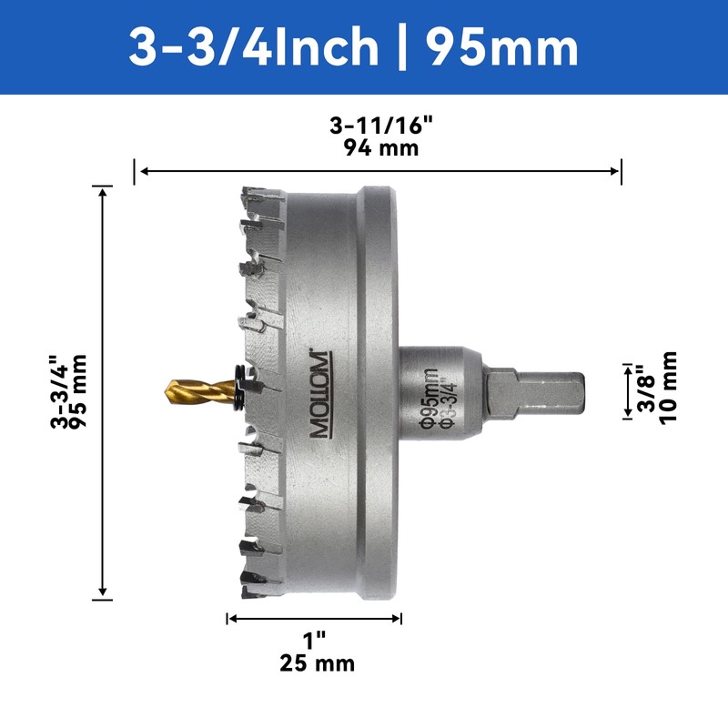 Mollom Heavy Duty Carbide Hole Saw, Hole Cutter cuts Stainless Steel, mild Steel, Iron, Copper, Brass, Plastic (3-3/4'' 95mm)