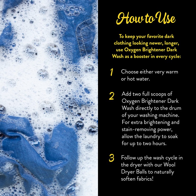 - STAIN TREATMENT: Emergency laundry spot treatment for dark or brightly colored clothing. Removes oil, wine, baby, and makeup stains; also removes set-in deodorant streaks. To use, soak clothing in warm or hot water with 2 scoops Oxygen Brightener for up to 2 hours or apply a paste to the stain and sit until dry. Brush off and launder as usual