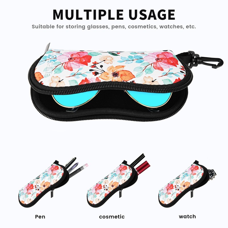 molshine Soft Sunglasses Case, Neoprene Zipper Glasses Case, Portable Glasses Bag with Hook for Men and Women, White flower, m