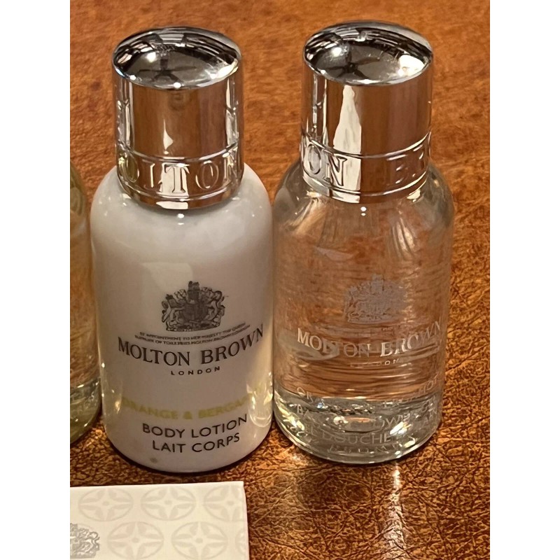 Molton Brown 5 travel toiletries Molton Brown shampoo conditioner shower gel body lotion soap