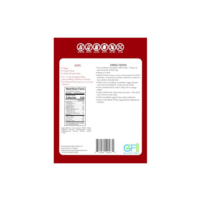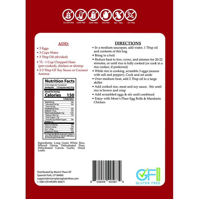 - Mom's Place Fried Rice Mix is GLUTEN-FREE, DAIRY-FREE, NUT-FREE, SOY-FREE, CORN-FREE, NON-GMO, NO MSG & PRESERVATIVE-FREE