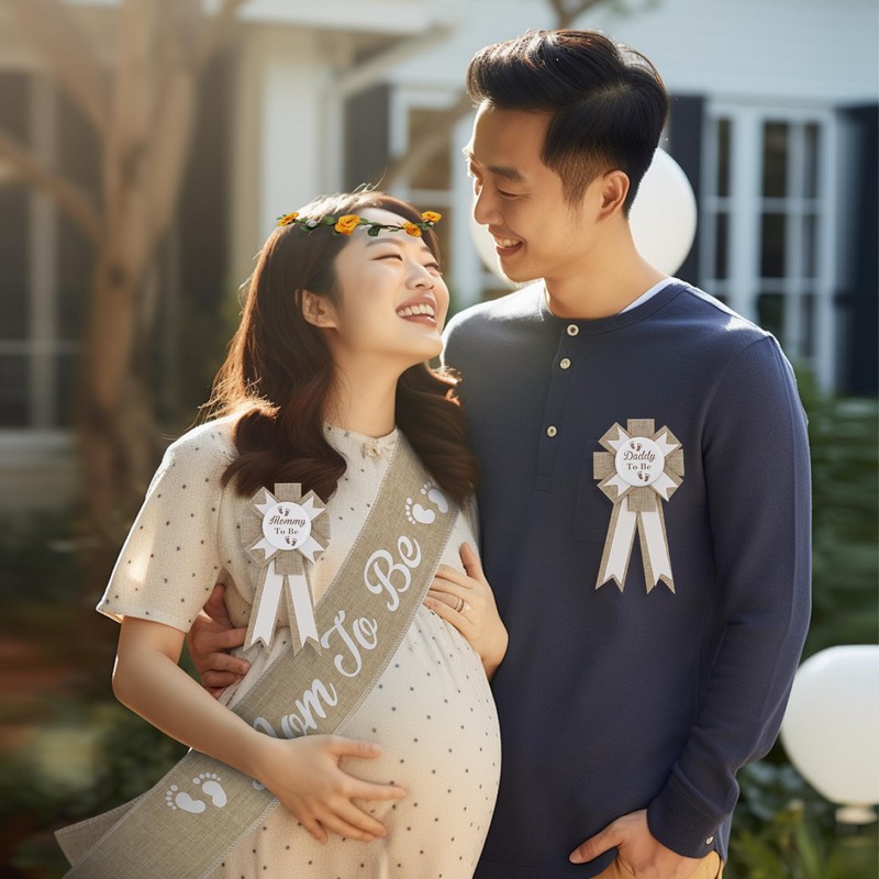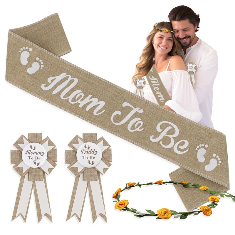 - 【 4pcs Mom to be Gift Set 】Our mommy to be sash set includes a stylish maternity sash, a mommy to be pin, a daddy to be pin and a beautiful flower crown. Perfectly suited for celebrating baby's arrival and making precious memories.