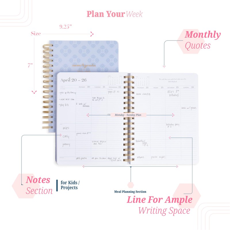 - Stay on top of your busy schedule with the momAgenda Desktop Spiral 18-Month Planner 2025–26, the original and iconic mom planner designed by a mom to help keep mothers effortlessly organized. Now featuring a flexible, waterproof, vegan leather cover and a durable spiral binding for added convenience, this weekly/monthly planner perfectly blends function and style.