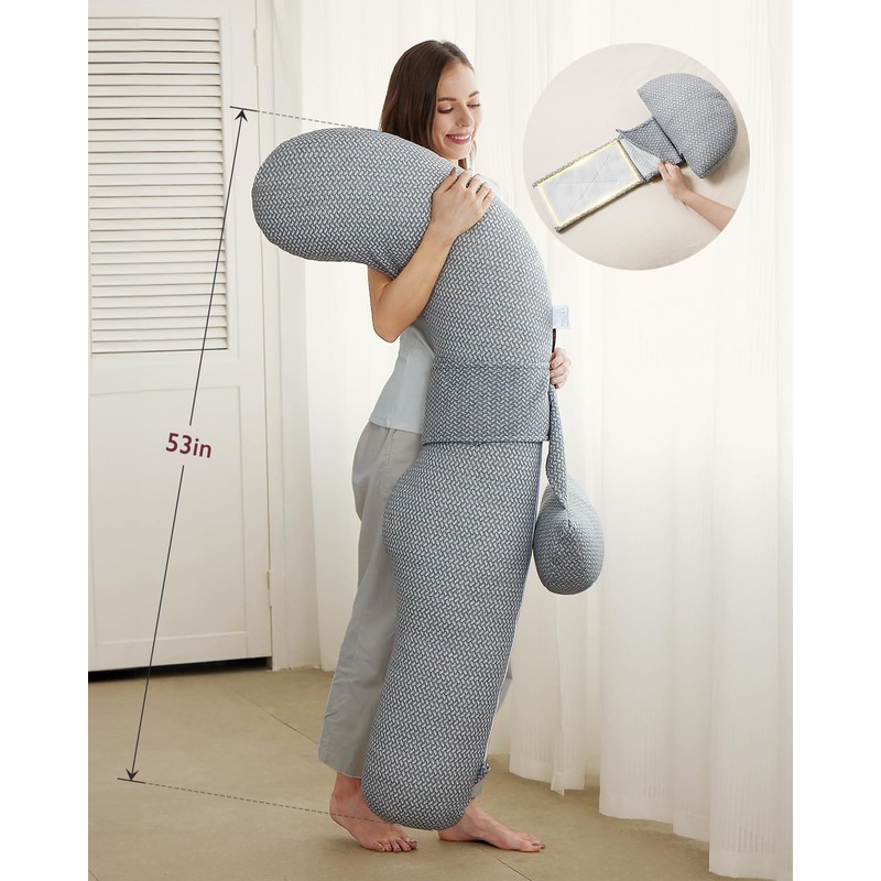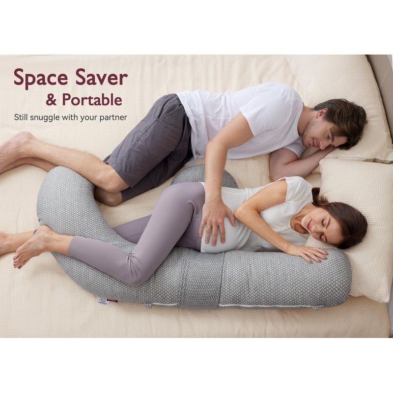 - Unlike other full-body maternity pillows that come with a built-in headrest, our F-shaped maternity body pillow allows you to use your own custom head pillow. This design eliminates the need to adjust to a new pillow, enabling you to enjoy a comfortable and restful sleep right away.
