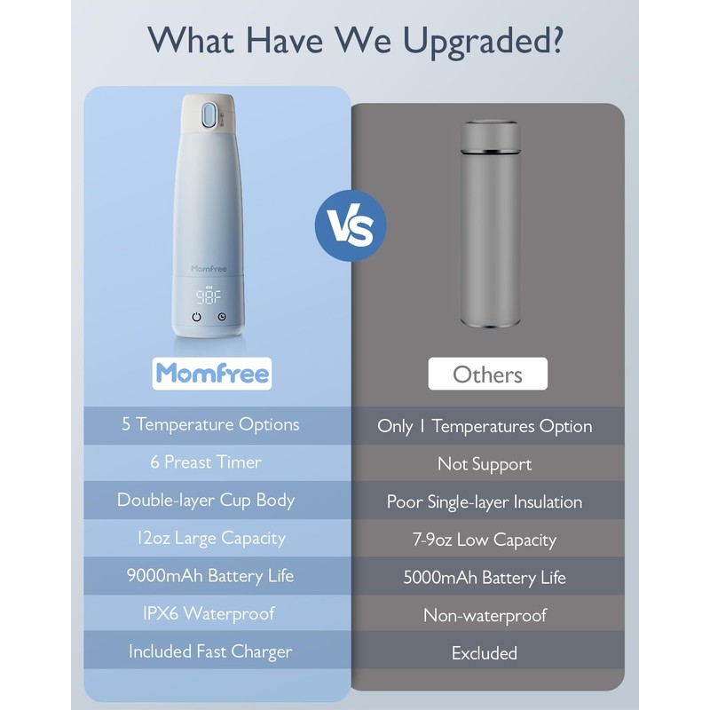 - đŒFast Heating & Keep Warm: Momfree portable water warmer could heat up the 12oz/340ml water or milk in 5-10 mins, with 6 timed preheating modes (30/60/90/120/150/180 minutes) to give your baby the freshest warm milk. Automatically keeps milk warm 6 hours after heating, making it perfect for nighttime feedings or on-the-go use.