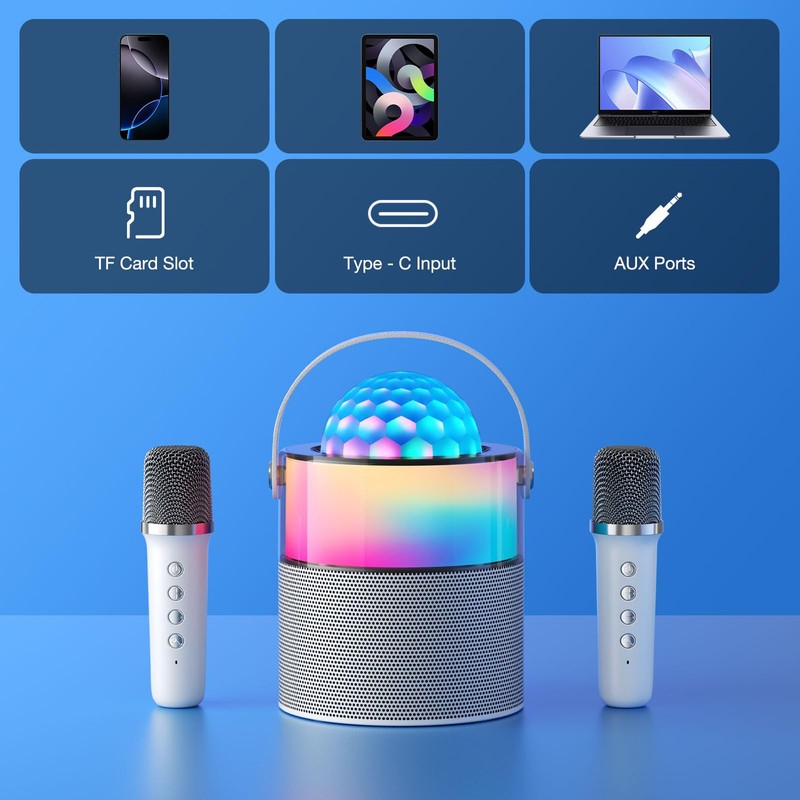 - Multifunctional Bluetooth System: The mini karaoke machine is built with the latest bluetooth 5.3 wireless streaming chip, which ensures instant pairing and provides more stable transmission and a longer distance up to 50 FT. The wireless mic will auto connect with the speaker when power on. It‘s also supports micro TF card solt, Type-C input and AUX ports connections, making it compatible with a range of devices including mobile phones, TV, DVD, iPads, tablets and PCs
