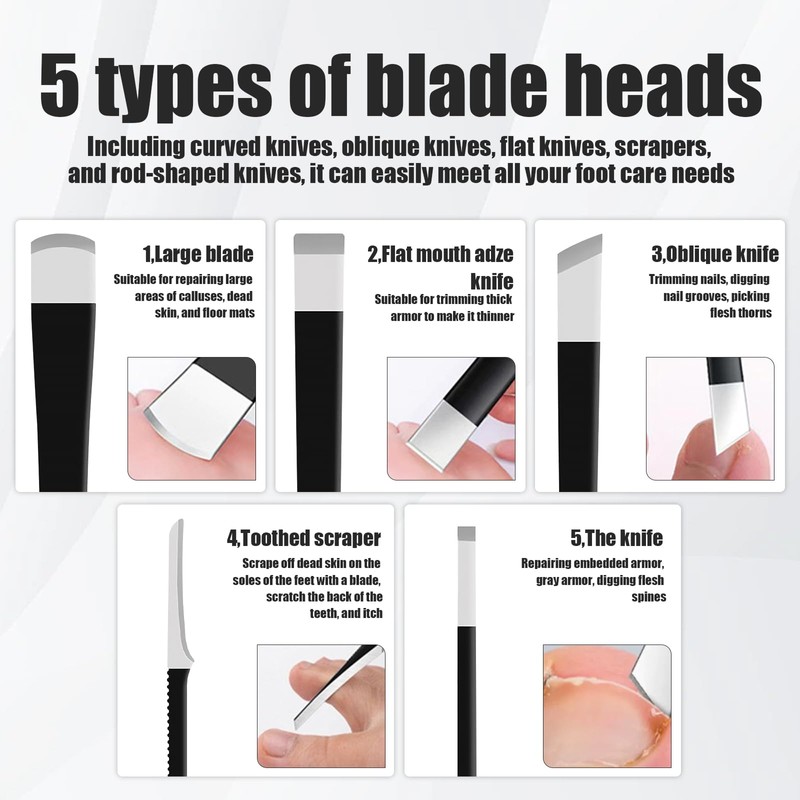 - Ein komplettes Set für Ihre Fußpflegebedürfnisse: Dieses professionelle Fußpflegeset enthält fünf Grundwerkzeuge, darunter gebogene Messer, schräge Klingen, flache Klingen, Abstreifer und streifenförmige Messer, damit Sie ganz einfach alle Ihre Fußpflegebedürfnisse erfüllen können.