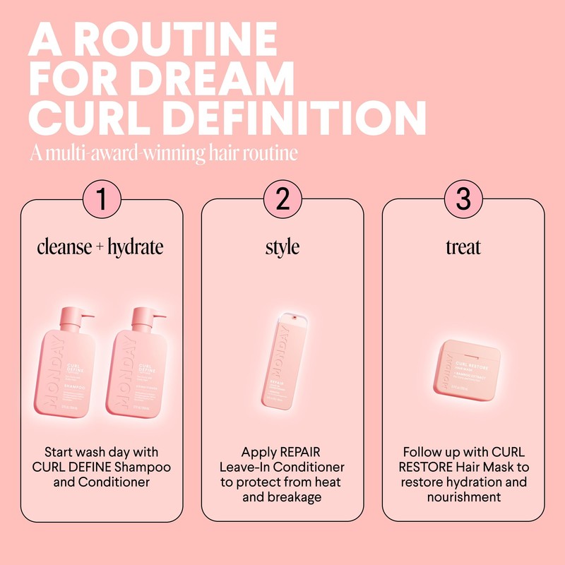 With active ingredients, hydrating Peptides and gentle naturals such as Coconut Oil, CURL DEFINE tames frizz and enhances the natural shape and shine of curls and coilswhile nourishing and strengthening hair. Our award-winning, clean formulas are dermatologically tested, pH balanced, contain ethically sourced natural extracts and are not tested on animals. MONDAY Haircares salon-quality Shampoo and Conditioner formulas are dermatologically tested, PH-balanced, and free from SLS, parabens and phthalates. They instead contain premium natural ingredients such as shea butter, coconut oil, rice protein, vitamin E and provitamin B to nourish and restore. Our range of Shampoo and Conditioner has major beauty awards, including a Cosmopolitan Holy Grail Beauty Award, Glamour Beauty Award, Cosmopolitan Beauty Award, and an InStyle Best Beauty Buy Award. MONDAY has also been featured by Vogue, ELLE, Harpers BAZAAR, Allure, Refinery and Byrdie. All of MONDAYs products are approved as cruelty-free under the Leaping Bunny programme. Were also proud to be recognised by PETA as a brand that does not test on animals. Our pink bottles are also made from % recyclable plastic to help minimise carbon footprint and reduce landfill.