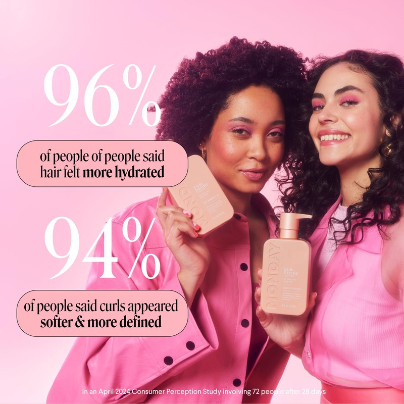 - CURL DEFINE SHAMPOO + CONDITIONER: MONDAY Haircare's CURL DEFINE Shampoo is a supportive formula containing hydrating Peptides and gentle natural ingredients such as Coconut Oil to tame frizz and enhance shinewhile nourishing and strengthening hair. Curls are left bouncy and frizz-free.