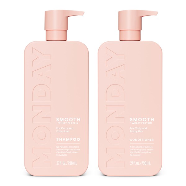MONDAY HAIRCARE Smooth Shampoo + Conditioner Bathroom Set (2 Count) 27 oz Each For Frizzy, Coarse & Curly Hair Made with Coconut Oil, Shea Butter & Vitamin E 100% Recyclable Bottle Pink