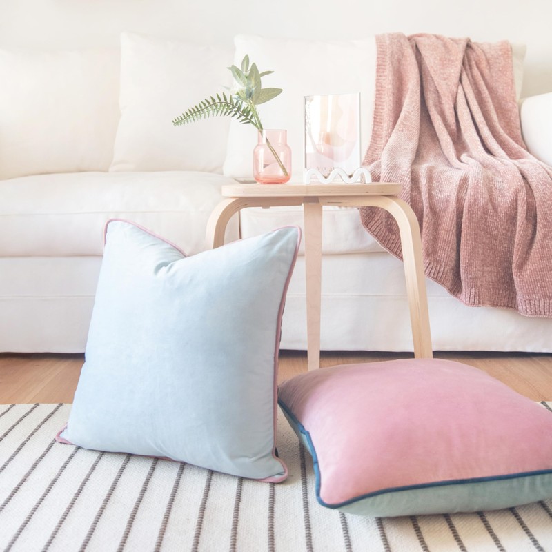 - SET OF 2: Includes 1 blue/light blue velvet pillow + 1 pink/teal velvet pillow