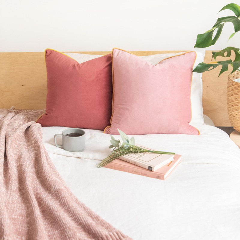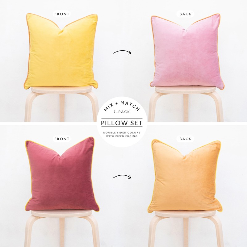 - SET OF 2: Includes 1 pink/bright yellow velvet pillow + 1 pink ochre/honey yellow velvet pillow