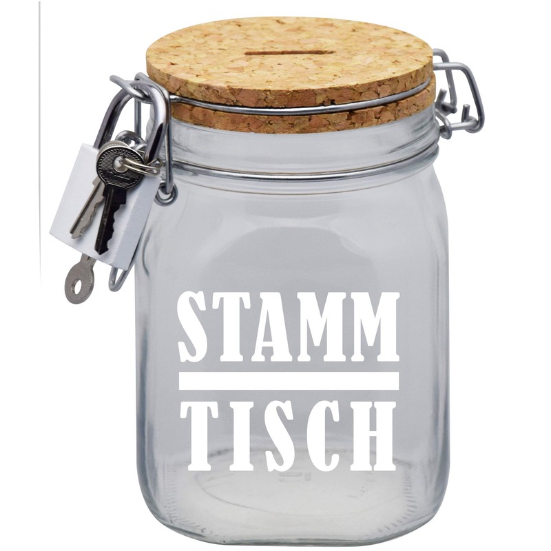• Glass money box contents: 16 x 10 x 10 cm corresponds to 1 litre volume, cork lid with economy slot, padlock with 3 keys. With a money box to write on yourself, you will also receive a branded chalk. Lightly moisten the chalk for better labelling. Normal water is suitable for cleaning.