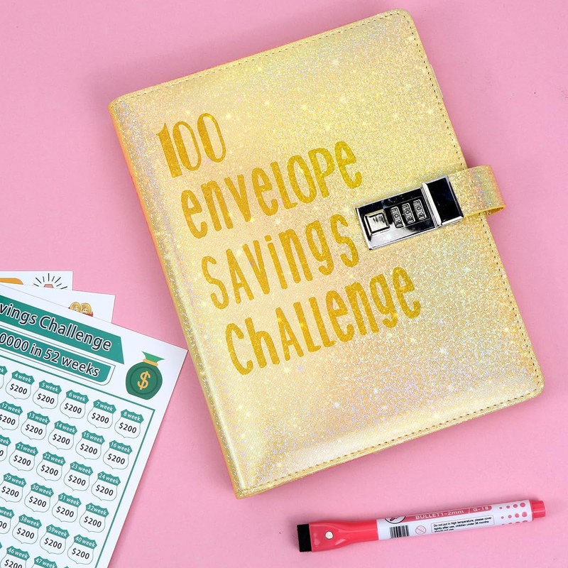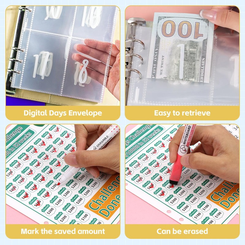 - You will receive the money book for money kit: the purple money saving folder contains 25 sheets of 4-ring cardboard, 1 whiteboard marker and 3 sheets of lunch box for 103 target levels, with combination lock. It is cool to complete the challenge and gain a sense of accomplishment and satisfaction, as well as show it to others.