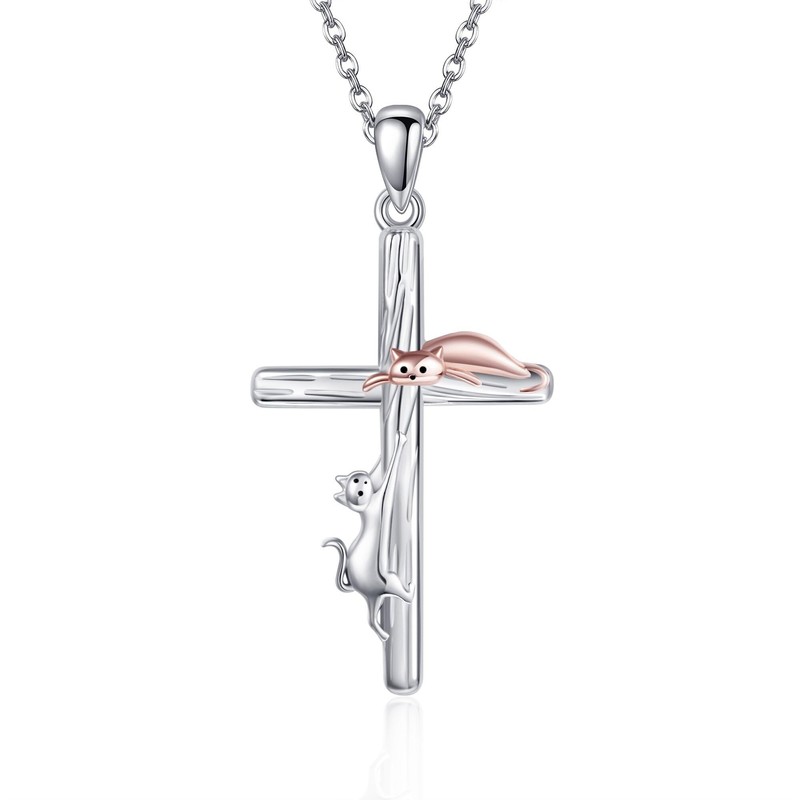 MONGAS Cat Cross Necklace Sterling Silver Cat Pendant Cat Jewelry Christian Confirmation Gifts for Women