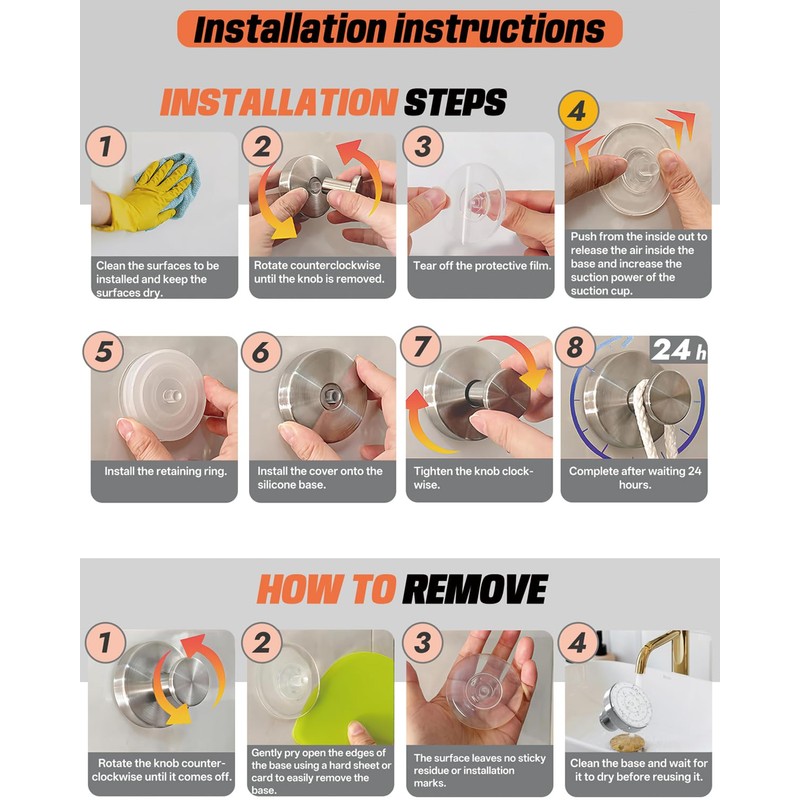 • [Easy to installation] 1.hoose and clean a smooth, non-porous surface. 2. Loosen the hook counter-clockwise. 3. Press the base firmly against the surface, then twist clockwise to secure. Detailed instructions and video instructions are provided.