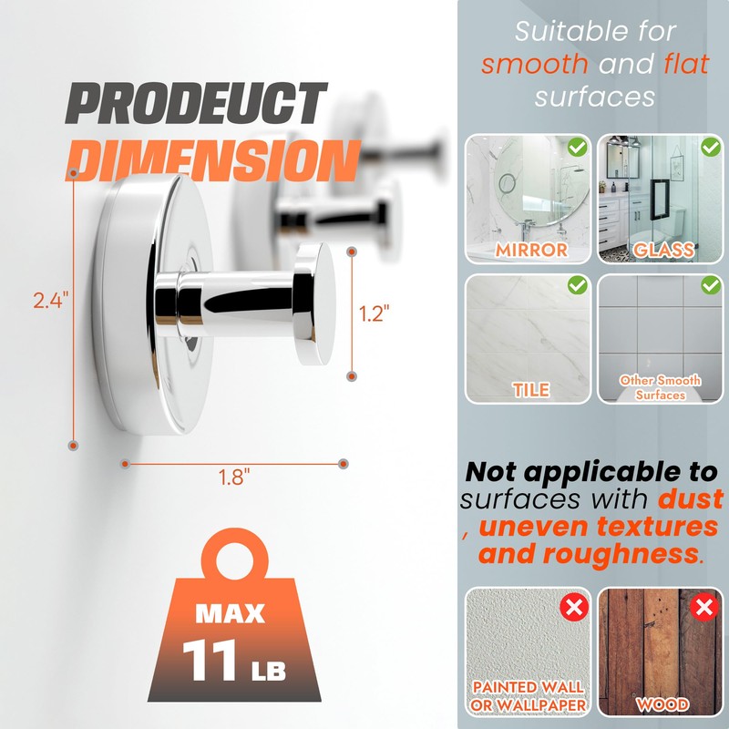 • [Top Performance and Durability] Suction towel hooks made of 304 stainless steel are rustproof and sturdy. The suction cup with strengthened structure is more stable and capable of holding up to 11 lbs. They are perfect for towels, robes, loofah, mesh sponges, body brushes, coats, jackets, clothes, and more.