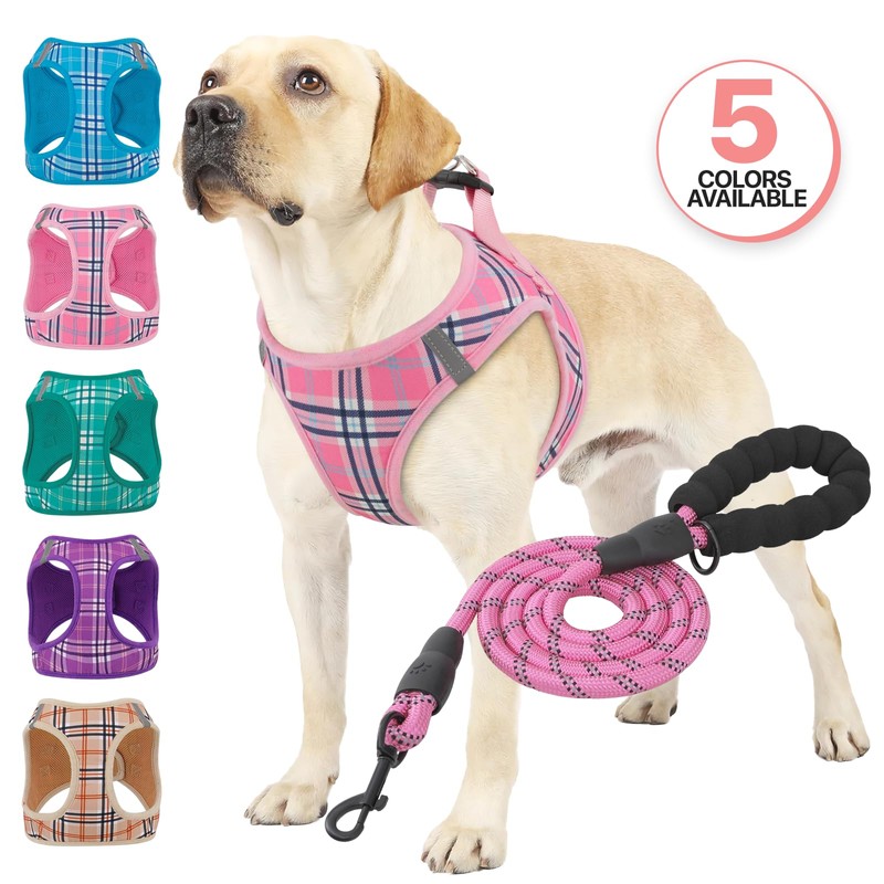 MoNiBloom No Pull Dog Harness w/Leash Set, Reflective Soft Puppy Padded Vest for Walking, Training, Easy to Put on Medium Large Dogs - Pink, XL