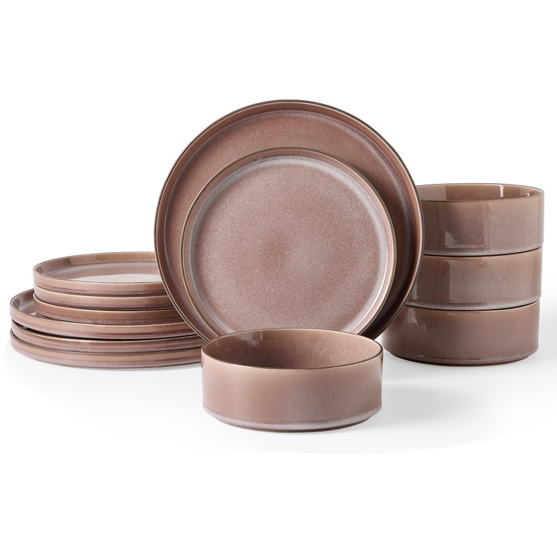 MONITO Ceramic Dinnerware Sets - Ceramic Plates and Bowls, Service for 4(12pcs), Microwave and Dishwasher Safe, Perfect Housewarming Gift, Vintage Brown