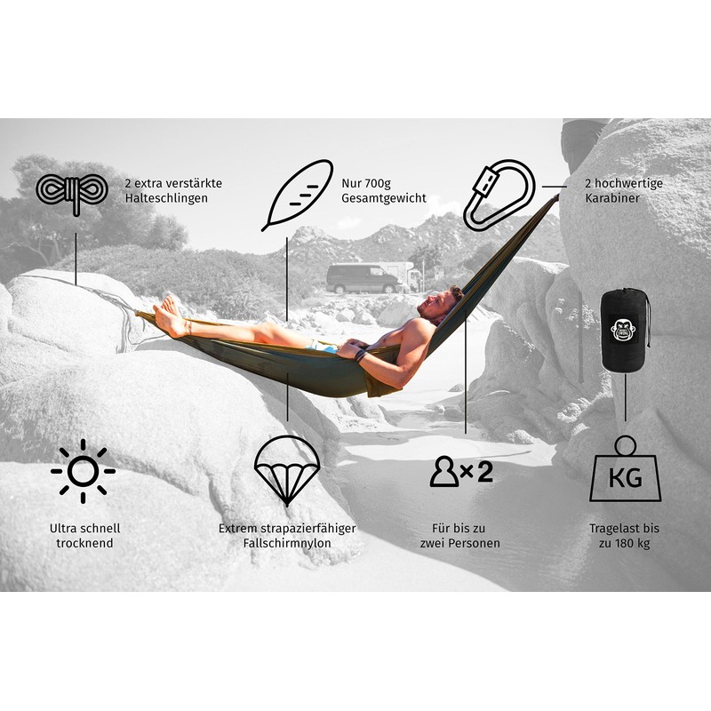 - Top material: Super breathable and quick drying thanks to the nylon fabric. The extremely durable, triple-locking seams support up to 180 kg in when tensed.