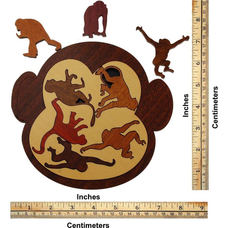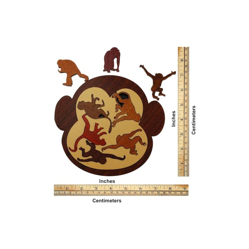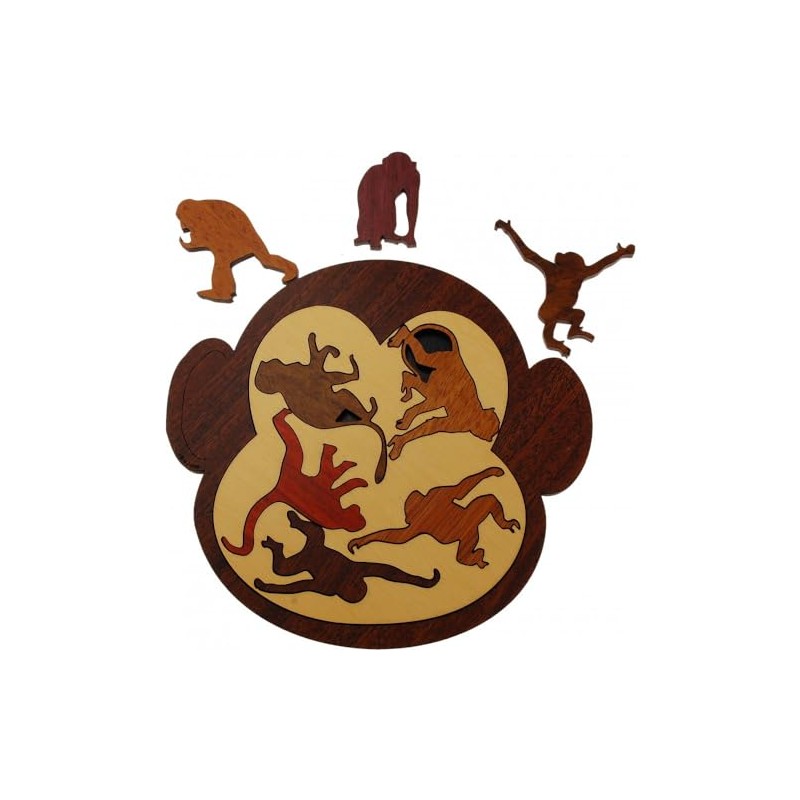 Object: Fit all of the monkeys into the tray. Eight unique monkeys are included in this packing puzzle. Can you find a way to neatly pack all 8 of these monkeys into the outer frame? The puzzle features a beautifully contrasting inner frame that is perfect for display.