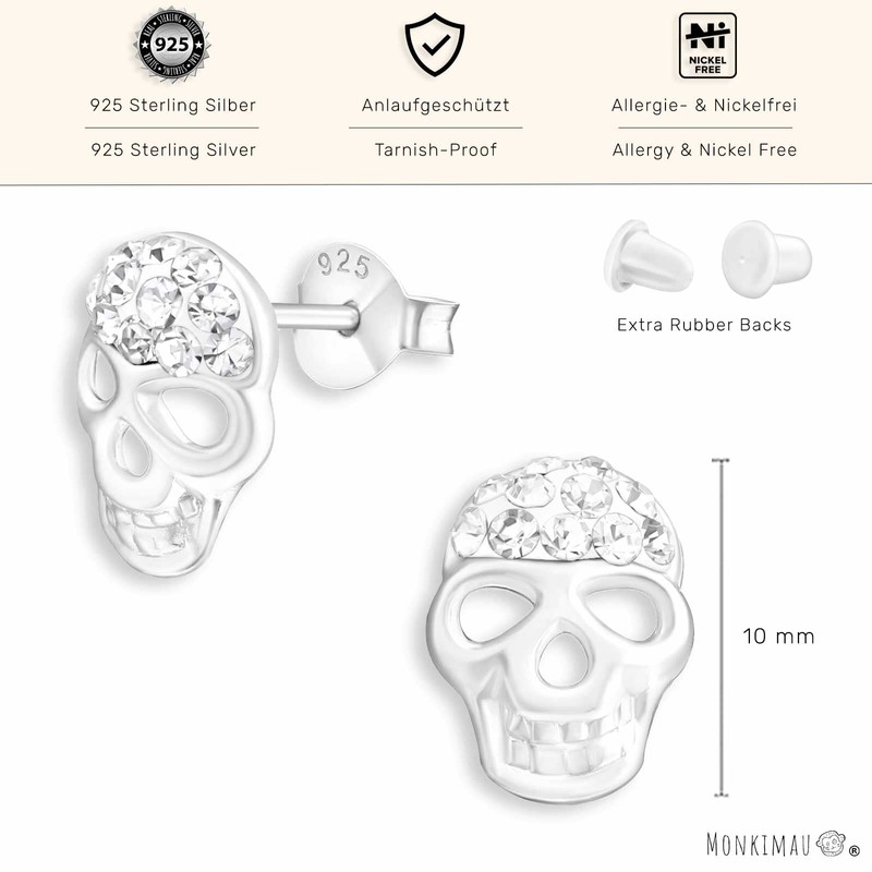 Monkimau Girls' Skull Stud Earrings Made of 925 Sterling Silver with 22 Crystals, Sterling Silver, silver