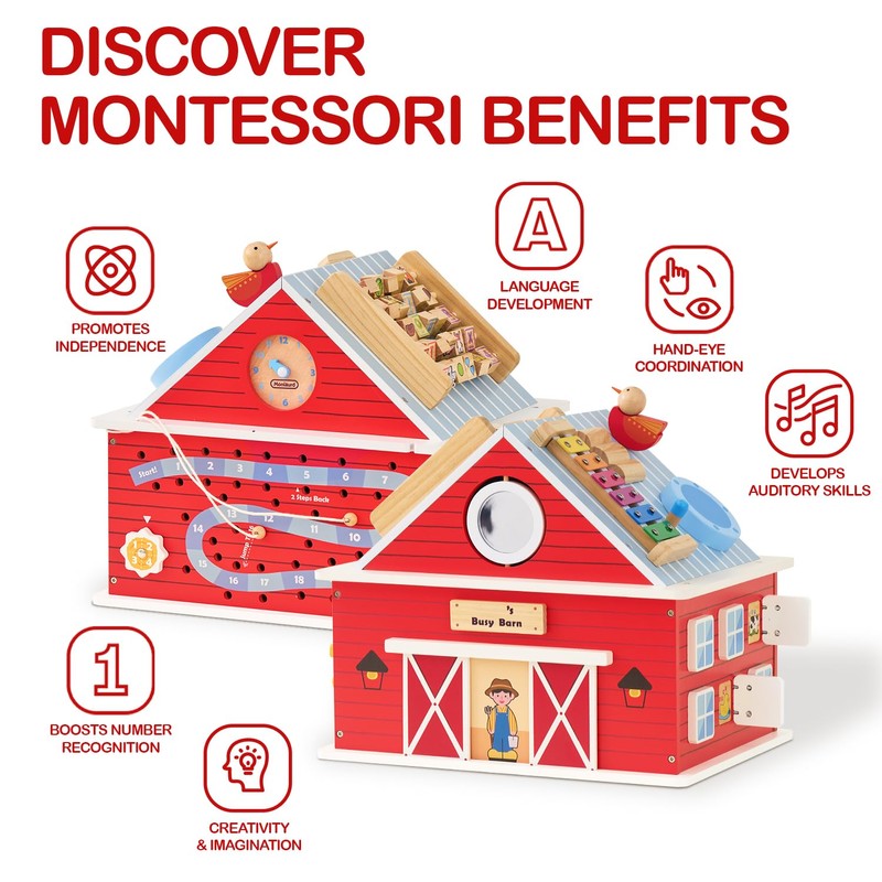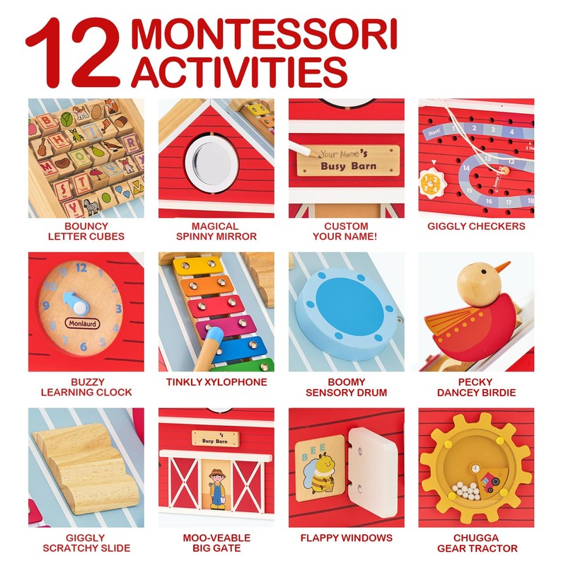 Monläurd® Wooden Farm Activity Center for Toddlers 1-3, 12-in-1 Montessori Busy Board Sensory Play Center, Large Barn Activity Cube Toy for Baby Fine Motor Skills, Daycare & Preschool Learning
