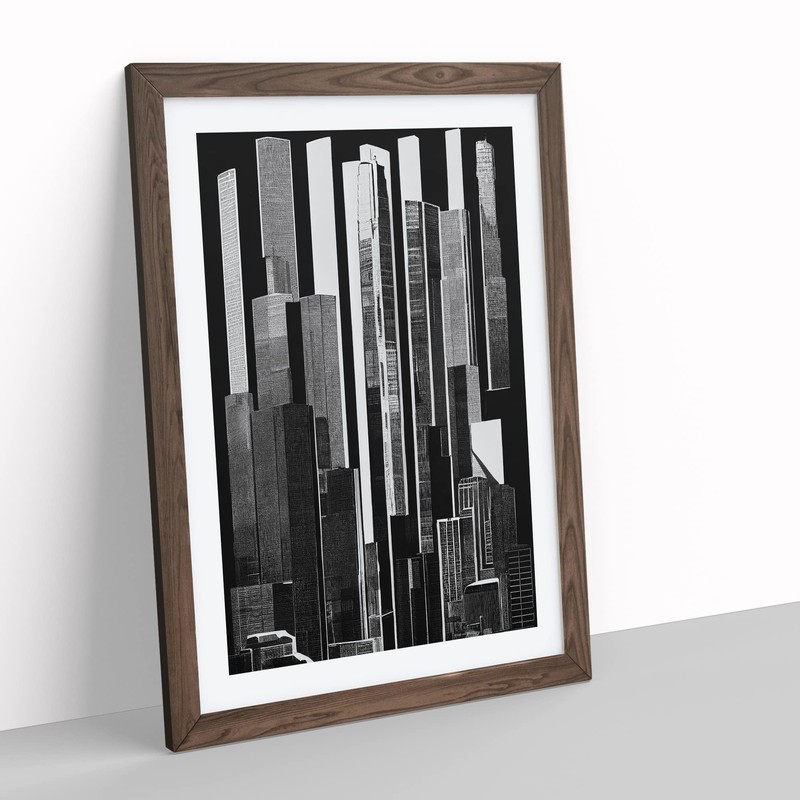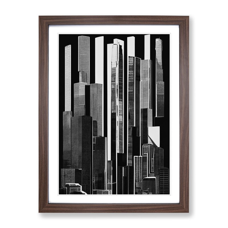 Monochrome City Skyline Abstract No.4 Framed Print for Living Room Bedroom Home Office Décor, Wall Art Picture Ready to Hang, Walnut A4 Frame (34 x 25 cm)
