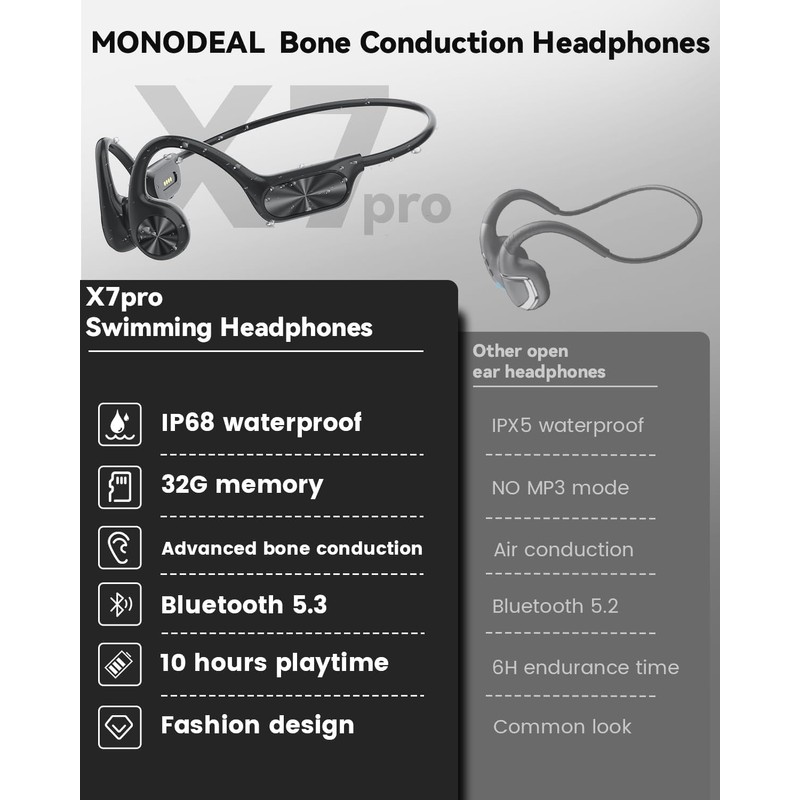 MONODEAL Swimming Headphones, IP68 Bone Sound Headphones, Bluetooth 5.3 Sports Bone Conduction, Wireless Swimming, Built-in 32 GB MP3 Player Memory, Open Ear Headphones for Swimming