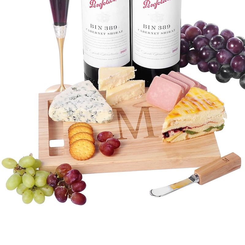 - PERFECTLY PERSONALIZED-- This cheese board crafted of natural Oak solid wood and paired with initial spreader. Monogramming M is laser deep engraved.