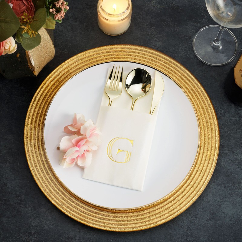 Monogrammed Napkins With Pocket For Flatware, 50-Pack 16" x 16" Gold Foil Letter D Disposable Linen-Feel Napkins, Prefolded Silverware Pocket Napkins For wedding, Party Or Baby Shower