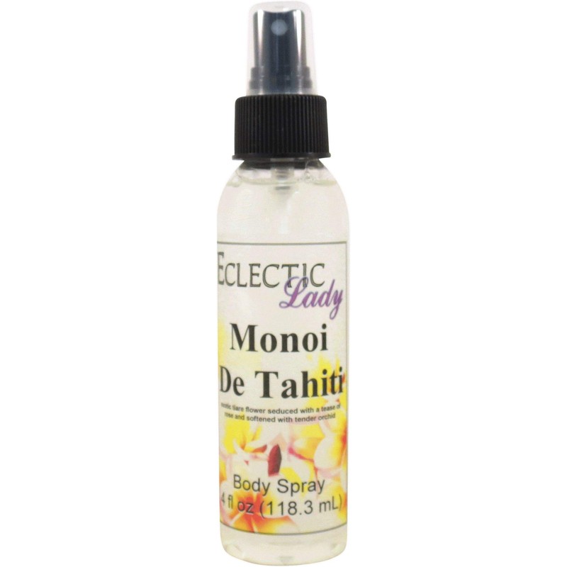 Our Monoi de Tahiti fragrance is notes of exotic tiare flower are seduced with a tease of rose and softened with tender orchid in an exceptionally beautiful blossom. This fragrance is phthalate free. Our body spray adds a little bit of moisture to your skin along with a light fragrance. Our Double Strength formula contains double the fragrance of our original body sprays for people who like a stronger body spray. All of our products are made to order. To avoid leakage in transit, Eclectic Lady tapes all caps on our sprays and places each bottle into it's very own reclosable bag.