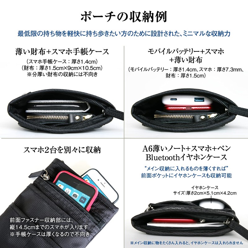 - Thin, Lightweight, and Not Bulky: This thin mini sacoche is easy to use to store your smartphone and your minimum belongings (small wallets, ballpoint pens, keys, etc.). Can not store long or thick wallets; Versatile: It can be attached to a carabiner pouch, belt pouch, neck pouch, sacoche bag, and the shoulder strap attached to the waist. Incredibly lightweight: The sacoche body is made of nylon, and is lightweight at about 2.8 oz (81 g). (Compatible with Large Smartphones) The thin pouch fits large screen smartphones, making it perfect for use with Phonacoche. [Good Cost] 1 year warranty & carabiner, shoulder strap, and belt loop for a variety of uses. The simple and chic design is great for many occasions.